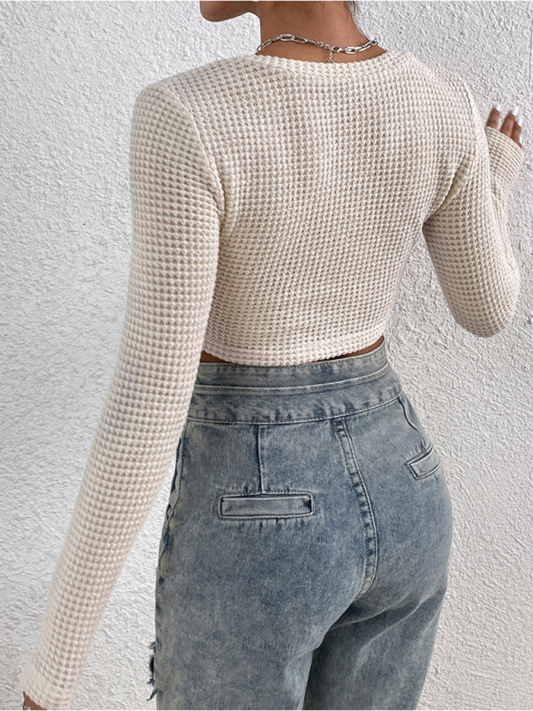 Women's hollow tight -fitting sexy umbilical V -neck long sleeve T -shirt